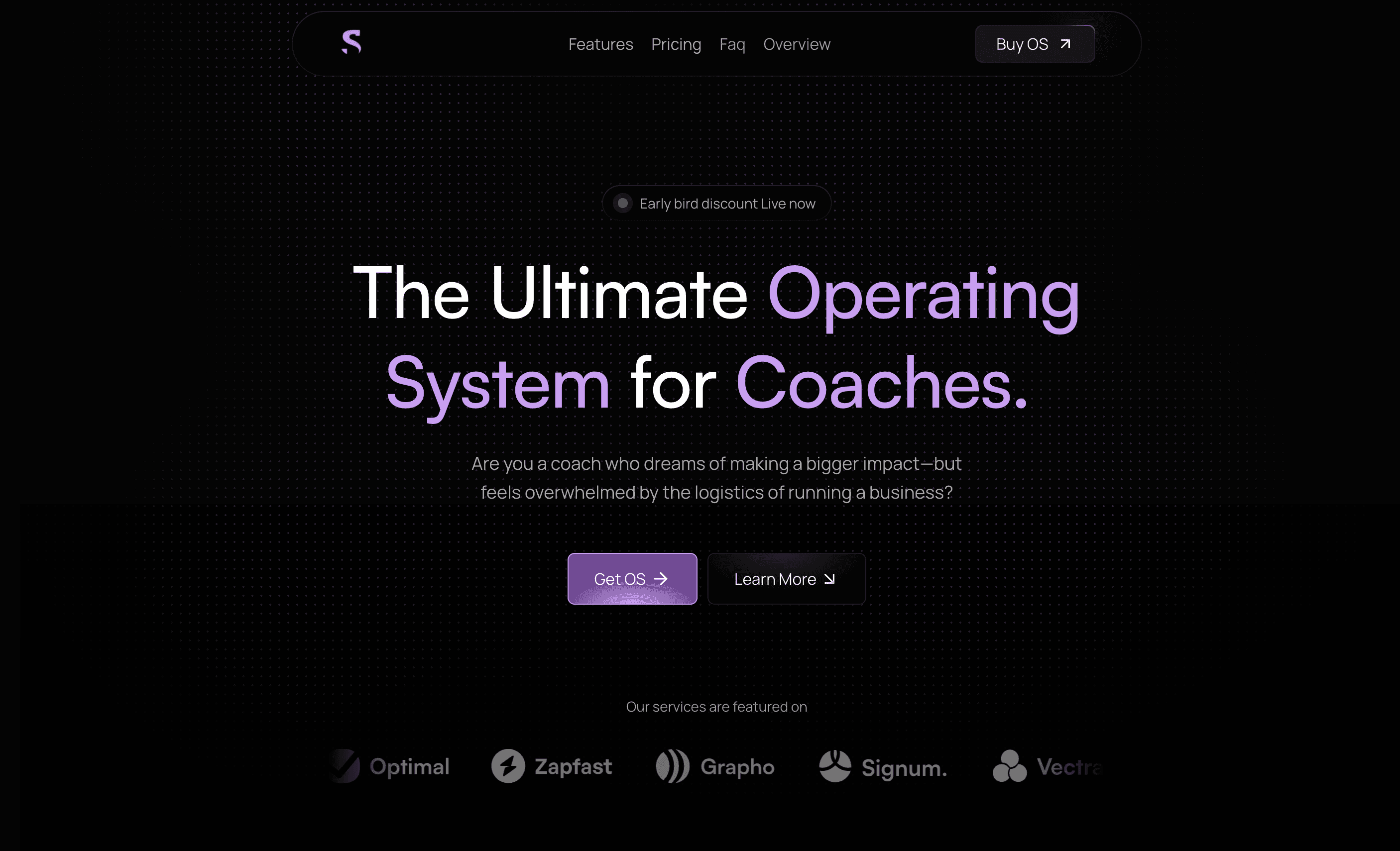 The Ultimate Operating System for Coaches Ready start and scale their business. Coaching OS is your all-in-one solution to start and grow your coaching business with ease, confidence, and clarity.